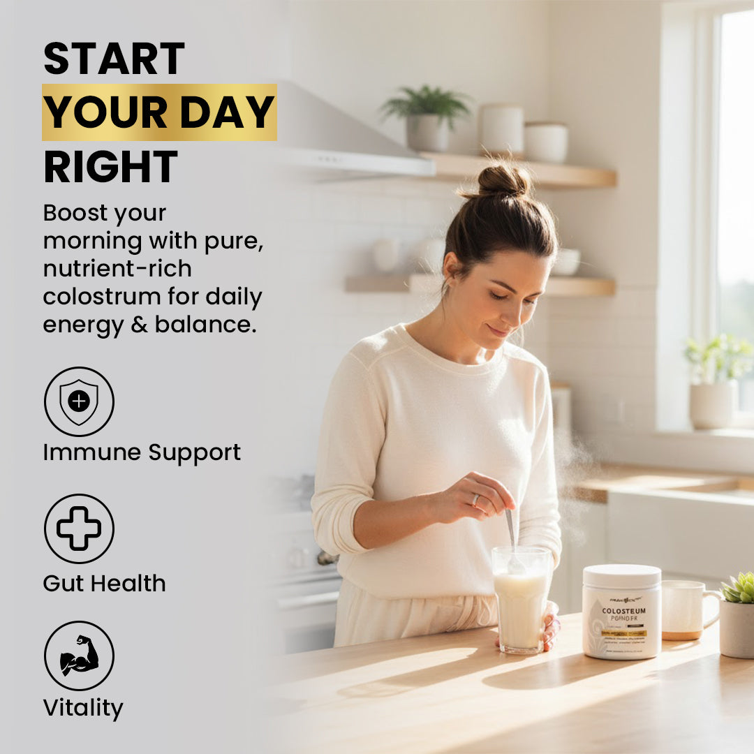 Each serving provides 2g of pure bovine colostrum powder, a natural source of essential nutrients such as protein and immunoglobulins (IgG). Colostrum is known as the body’s “first food,” making it a unique addition to your nutrition routine. Our colostrum supplement is designed to complement a balanced diet, giving you a simple way to support daily nourishment.